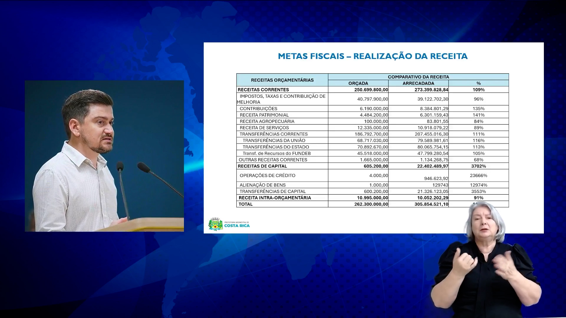 Conforme a apresentação, o município encerrou o exercício com arrecadação acima do estimado. A previsão de receita para 2025 era de R$ 262.300.000,00, enquanto a receita arrecadada chegou a R$ 305.854.521,10, cerca de 17% acima do projetado. No…