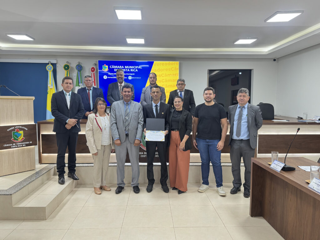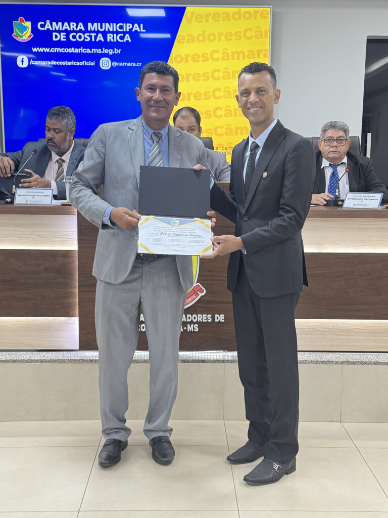 Na manhã desta segunda-feira (08), durante a 43ª sessão ordinária da Câmara Municipal de Costa Rica, o vereador Claudomiro Martins Rosa entregou oficialmente a Moção de Congratulação e Apoio nº 07/2025 ao Pastor Felipe Eugênio Gama, em reconhecimento à sua nomeação como presidente do COMPLECOR — Conselho de Pastores e Líderes Evangélicos de Costa Rica.