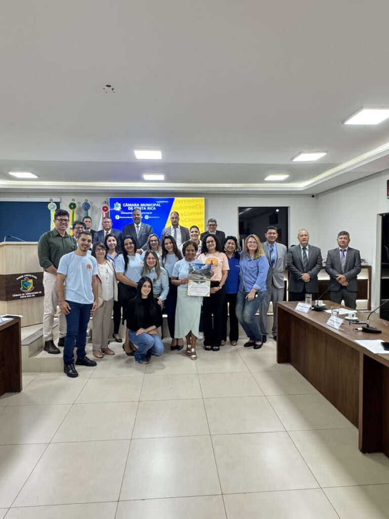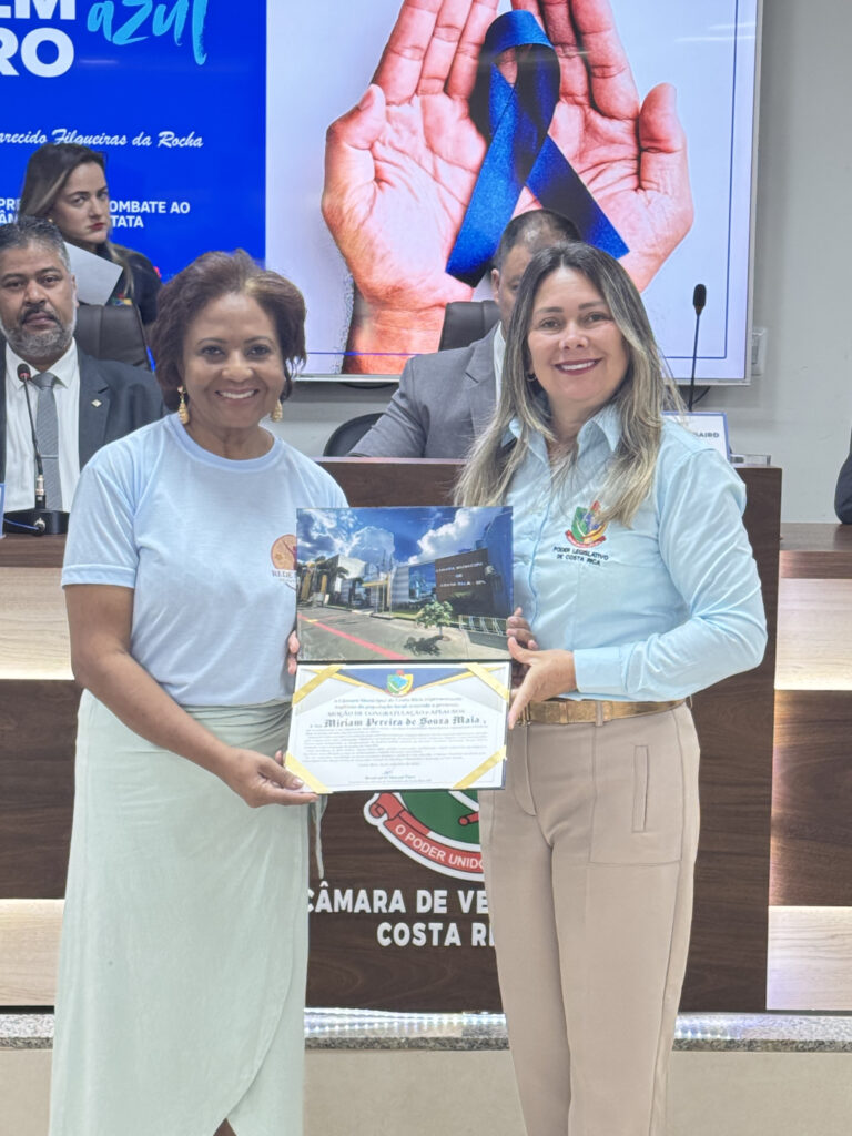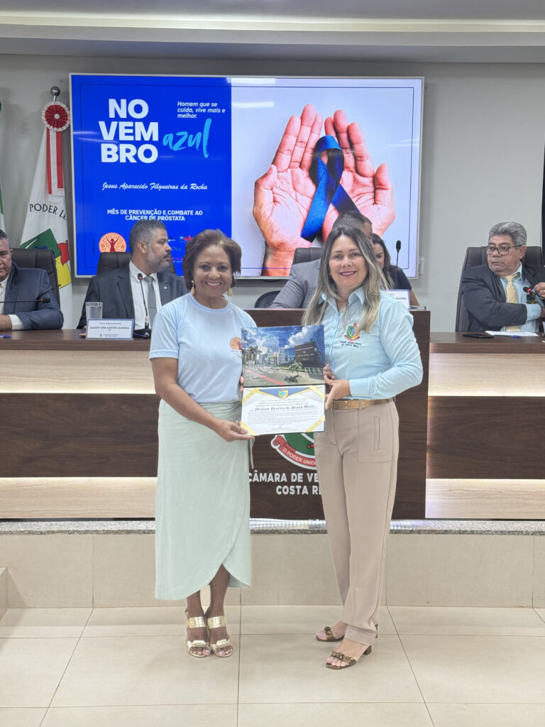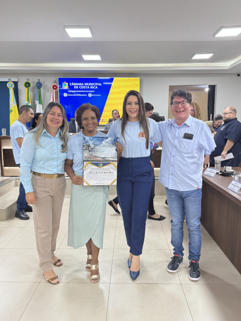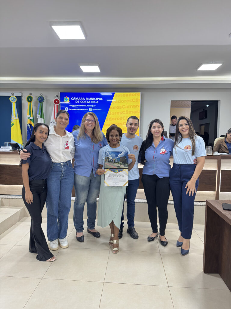 A Moção nº 14/2025, de autoria da vereadora Rosângela Marçal Paes, foi entregue à Sra. Mirian Pereira de Souza Maia, em reconhecimento à sua trajetória de dedicação e voluntariado em prol da comunidade, com destaque para sua atuação como presidente da Rede da Mulher de Costa Rica de Combate ao Câncer.