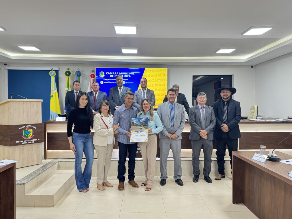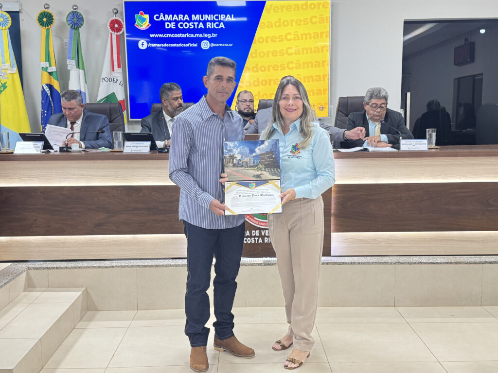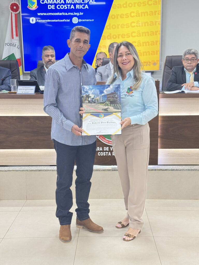 Em sessão realizada nesta segunda-feira (03), a Câmara Municipal de Costa Rica realizou a entrega das Moções de Congratulação e Aplausos nº 12 e nº 14 de 2025, homenageando os cidadãos Roberto Paes Barbosa e Mirian Pereira de Souza Maia pelo relevante trabalho prestado à comunidade costarriquense.