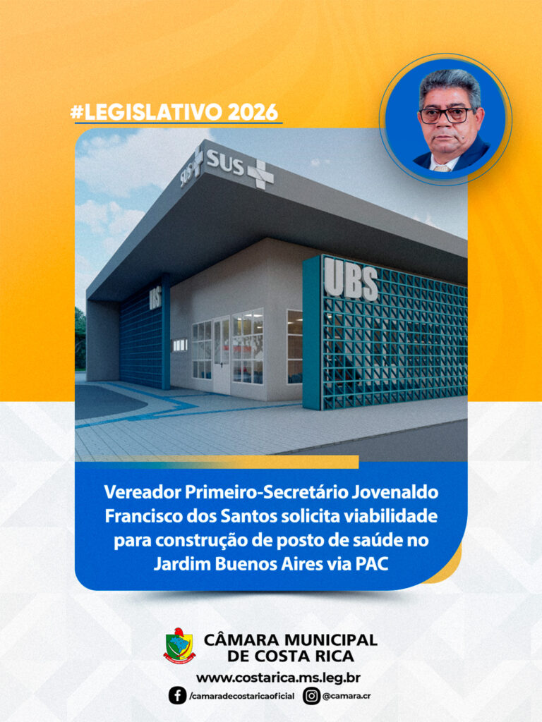 Durante sessão da Câmara Municipal de Costa Rica, foi apresentada a indicação nº 017/2026, de autoria do primeiro-secretário Jovenaldo Francisco dos Santos (Juvenal da Farmácia), solicitando a viabilização da construção de um posto de saúde no bairro Jardim Buenos Aires, por meio do Programa de Aceleração do Crescimento (PAC).