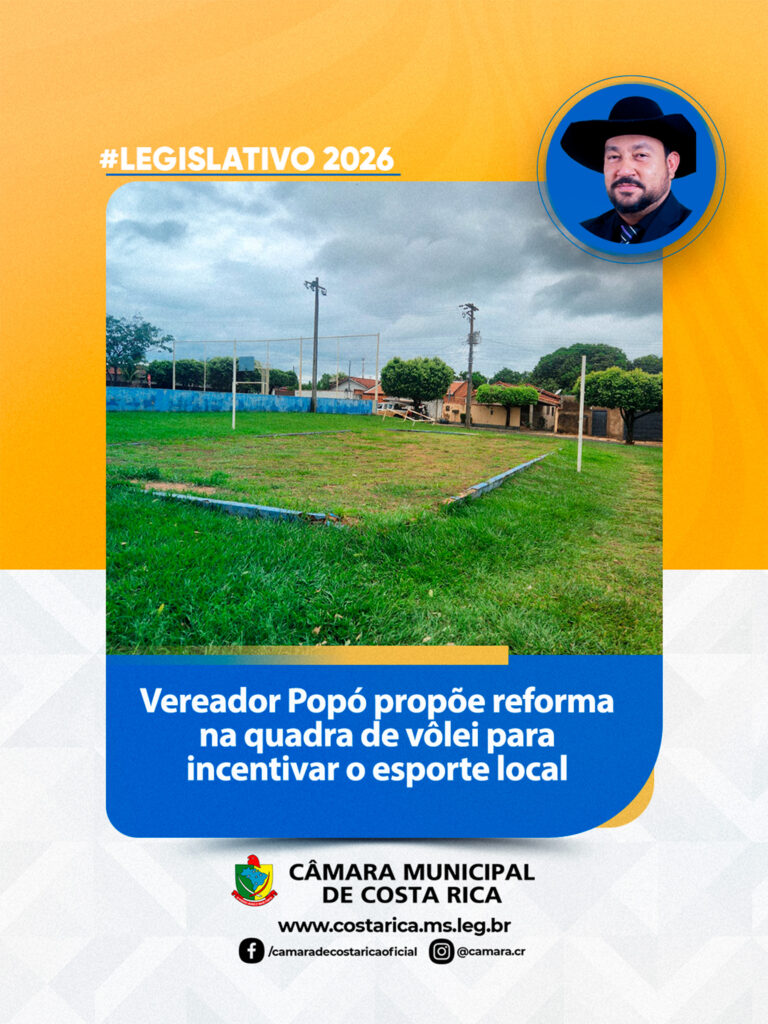 Durante sessão da Câmara Municipal, o vereador Alecksander da Silva Pimenta (Popó) apresentou a indicação nº 020/2026, solicitando a reforma e a devida manutenção da quadra de vôlei de areia localizada no bairro Jardim Sucuriú.